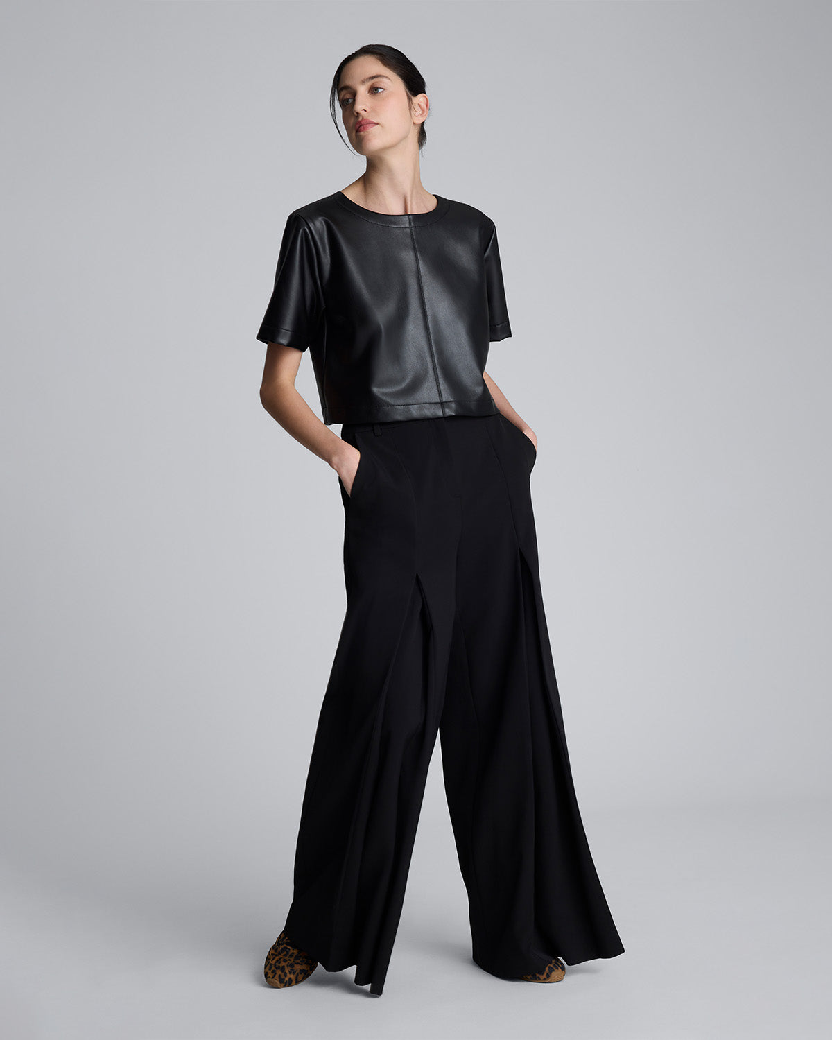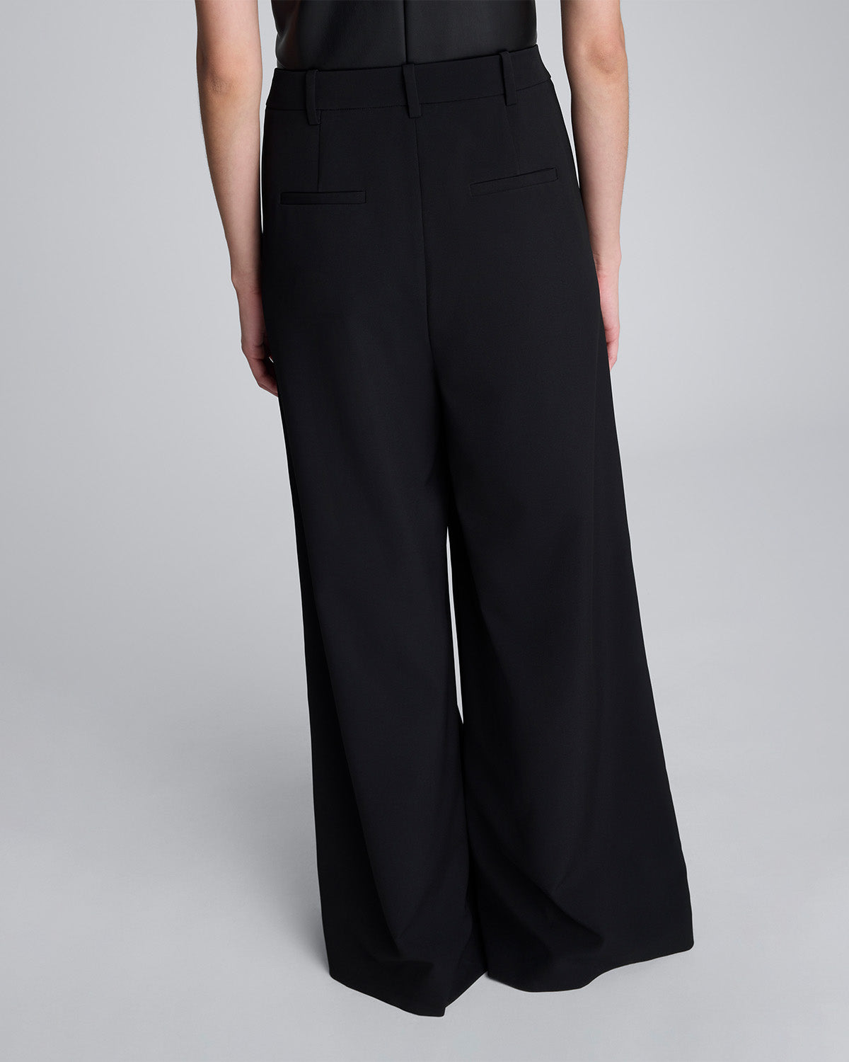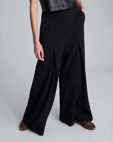 Este pantalón de pierna ancha presenta un diseño sofisticado con una silueta fluida y contemporánea. Confeccionado en un tejido estructurado de tono negro profundo, destaca por su corte amplio y los pliegues marcados en el frente que aportan movimiento y volumen a cada paso.