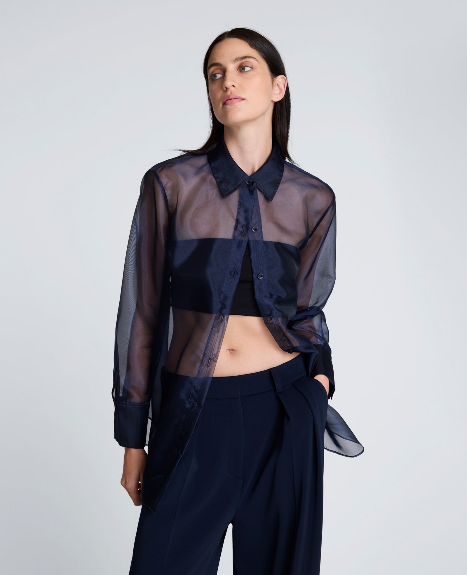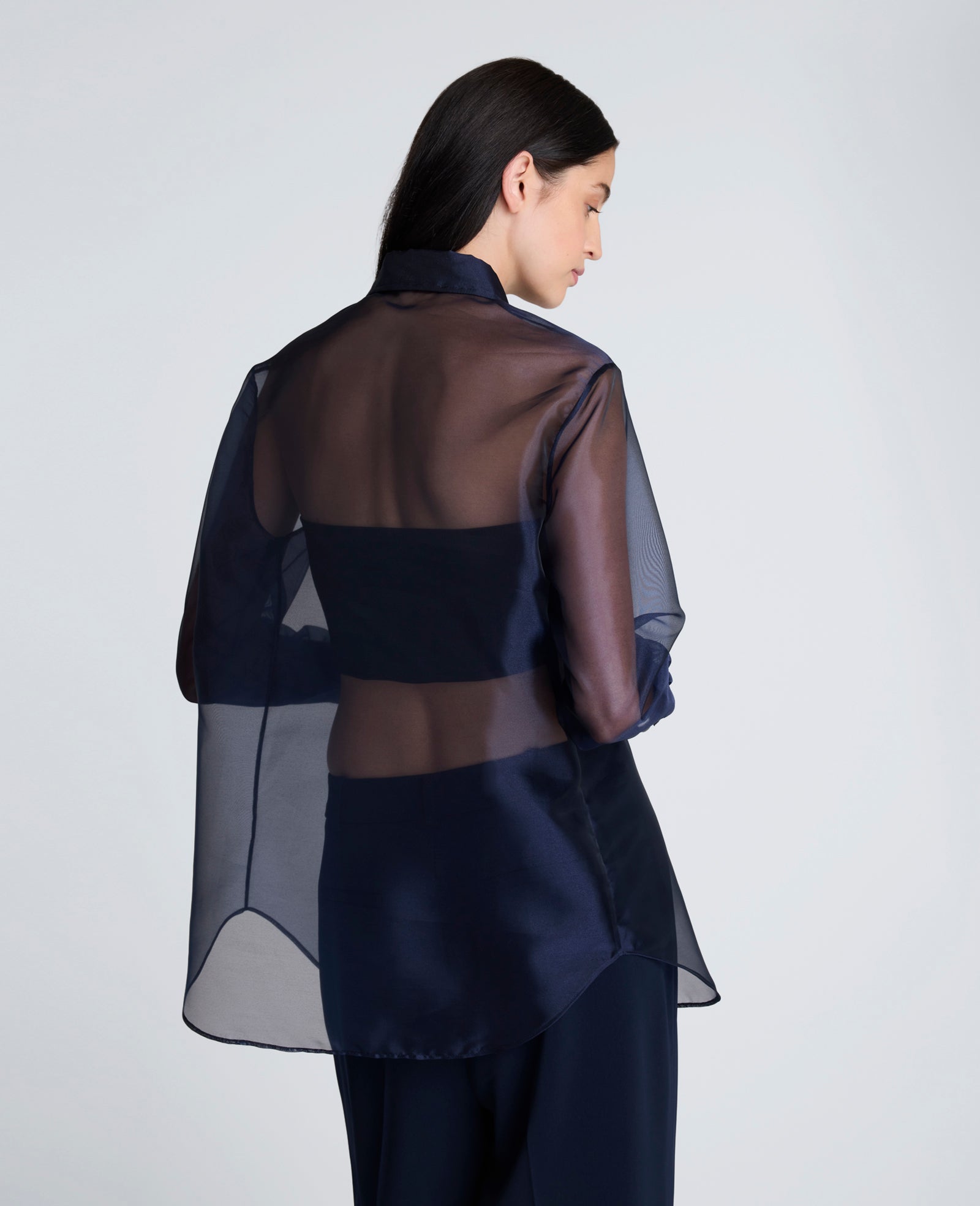 Esta camisa oversized de organza transparente combina ligereza y sofisticación para crear un efecto moderno y etéreo. Confeccionada en organza 100% poliéster, su estructura translúcida permite un juego de transparencias que resalta las prendas interiores,aportando un aire audaz pero elegante.